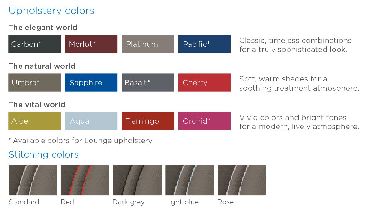 Both the seamless Premium upholstery (left) and the soft Lounge upholstery (right) ensure high comfort even during long treatments.