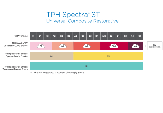 TPH Spectra ST was designed to provide simplified shading. Thanks to an enhanced chameleon blending effect, full coverage of the 16 VITA®1 classical shade system (A1-D4) can be covered with just five TPH Spectra ST shades of moderate translucency. In addition, a bleach white (BW) shade is available.