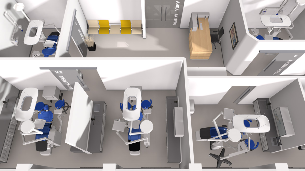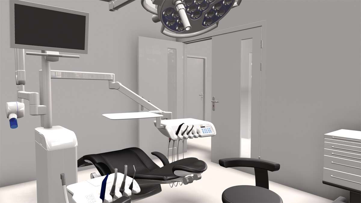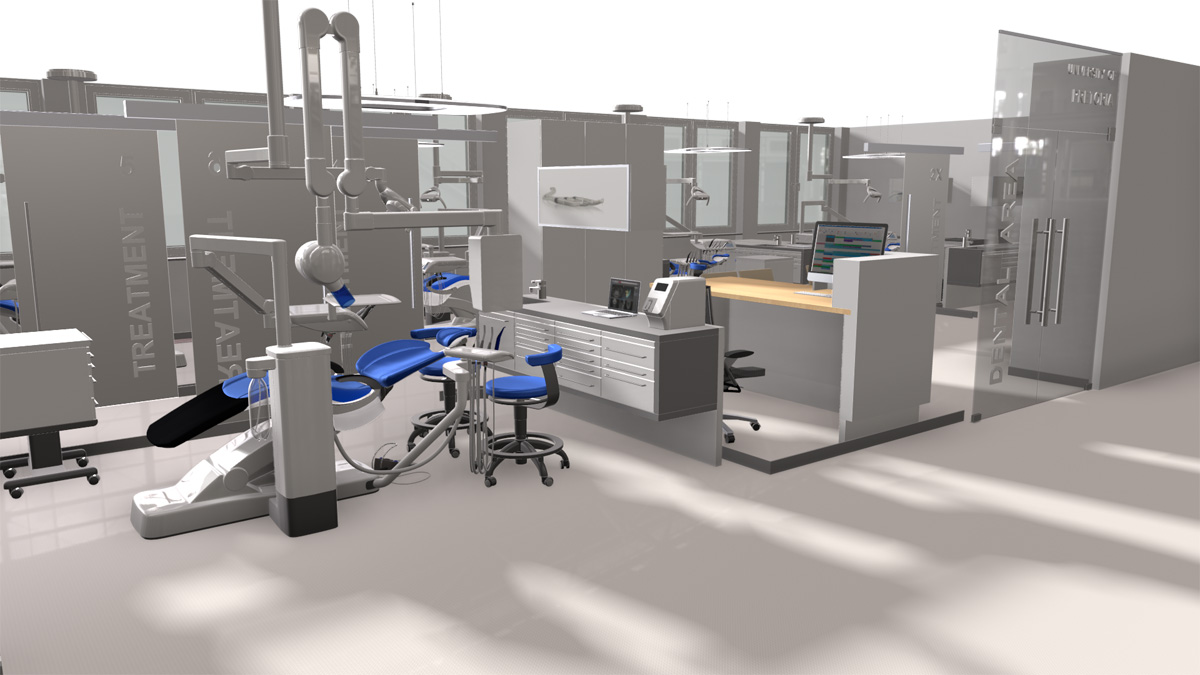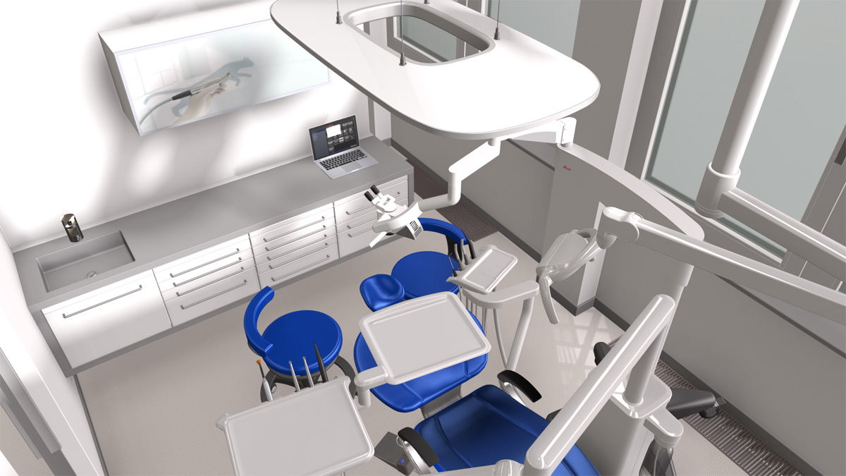The realistic visualization of a project makes the construction process more coordinated and precise. There are various ways to graphically represent your ideas. Classic two-dimensional floor plans continue to be the indispensable basis for precise planning, for both architects and building technicians. However, actual users often find it difficult to imagine their daily working environment and work processes just from these black lines on white paper. The team of experts at Dentsply Sirona thus has a design team specialized in both precise two-dimensional floor plans and 3D simulation. In the interactive 3D floor plan, the customer is guided through all the rooms and levels of the new clinic complex, both from a first-person perspective and as a bird’s-eye view.